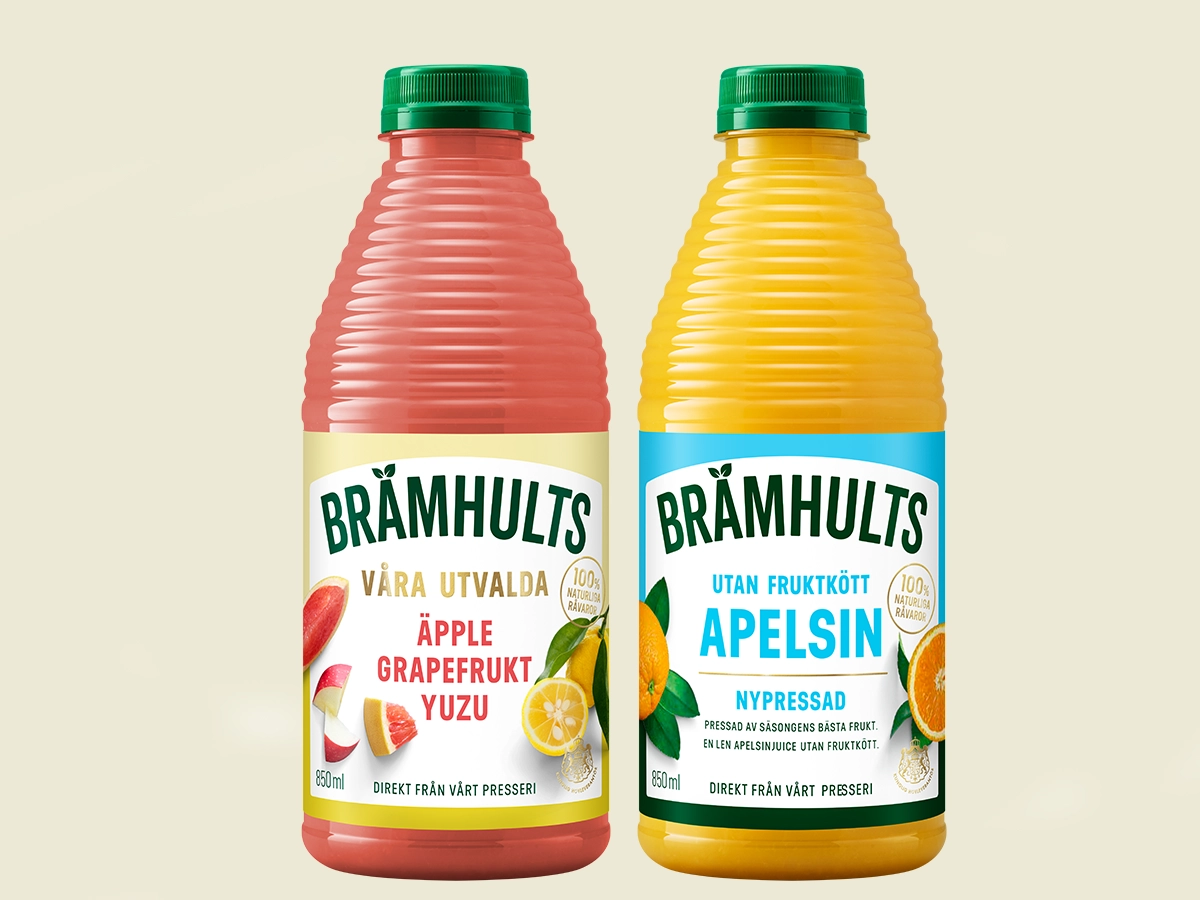 Brämhults satsar i höst på två nyheter som möter konsumenternas önskemål. Först ut är Nypressad apelsin utan fruktkött en len premiumjuice för alla som föredrar en mjukare apelsinupplevelse. Samtidigt lanseras Våra utvalda: Äpple, Grapefrukt & Yuzu, där klassiska svenska äpplen får sällskap av grapefruktens friska syra och den asiatiska yuzuns exotiska ton.