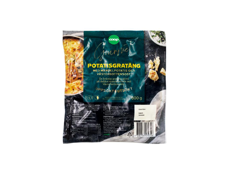 Coop Gourmet potatisgratäng på 800 gram med mandelpotatis och västerbottenost för cirka 36 kronor i butik gladde juryn som var överens om att det var en ”väldigt trevlig gratäng”.
