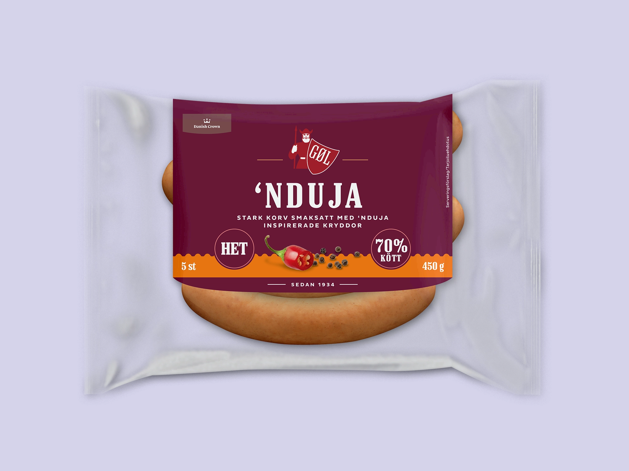 GØL lanserar nyheten ´Nduja 450 g som är en het kryddkorv och en spännande uppstickare i korvhyllan. Årets nya grillare är en riktigt stark kryddkorv med smak av Nduja-inspirerade kryddor, som chili, paprika och peppar.