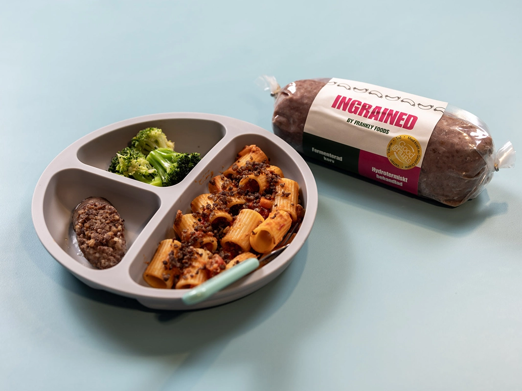 Ingrained bygger på en enkel idé hälften av köttet ersätts med hydrotermiskt behandlat svenskt korn. Det ökar mineralupptaget och sänker klimatavtrycket utan att förändra den traditionella karaktären i korven.