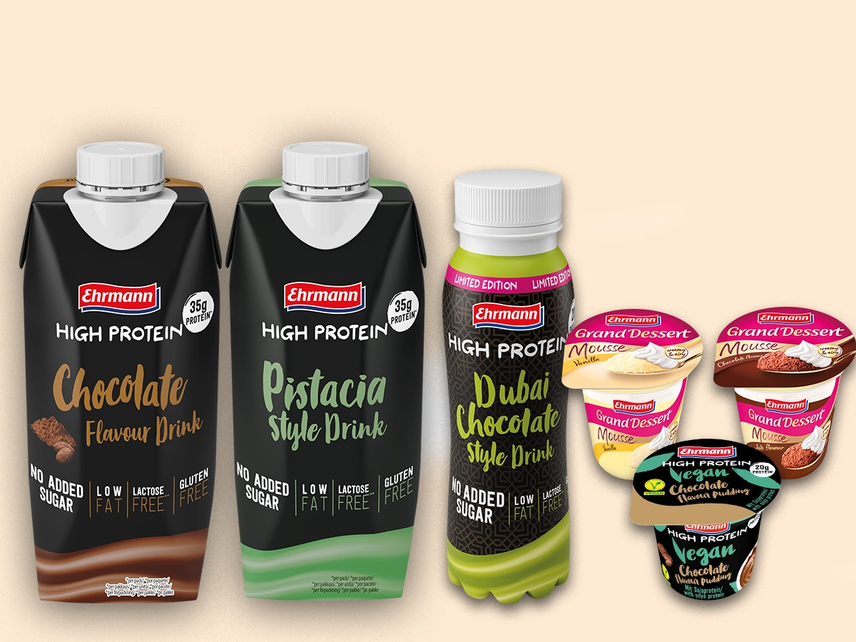 Ehrmann lanserar en unik proteindryck inspirerad av Mellanöstern. Dubai Chocolate Style kombinerar kadayifdeg, pistagepuré och tahini med en len chokladsmak.
