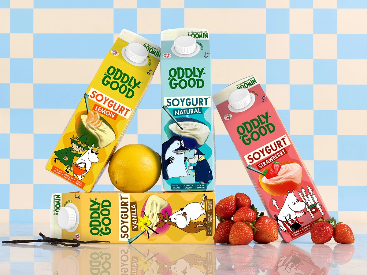 Inför Mumintrollens 80-årsjubileum släpper Oddlygood en specialutgåva av Soygurt® i 1 kg-förpackning. De fem smakerna, Naturell, Jordgubb, Peach-Raspberry, Vanilj och Citron lanseras nu med färgstarka motiv där klassiska Muminfigurer möter varandra i oväntade kombinationer.